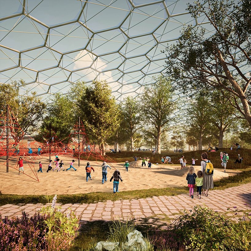 Центральным объектом парка станет огромный стеклянный купол, под которым будут созданы благоприятные условия для общения горожан, занятий спортом и проведения массовых мероприятий.